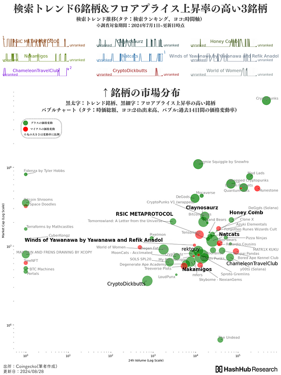 上は、調査期間中の検索トレンド上位6銘柄及び過去14日間のフロアプライス上昇率の高い4銘柄の計10銘柄を対象とした、Q3 2023年以降の検索トレンド推移グラフと過去14日間の市況を可視化したバブルチャートです。
