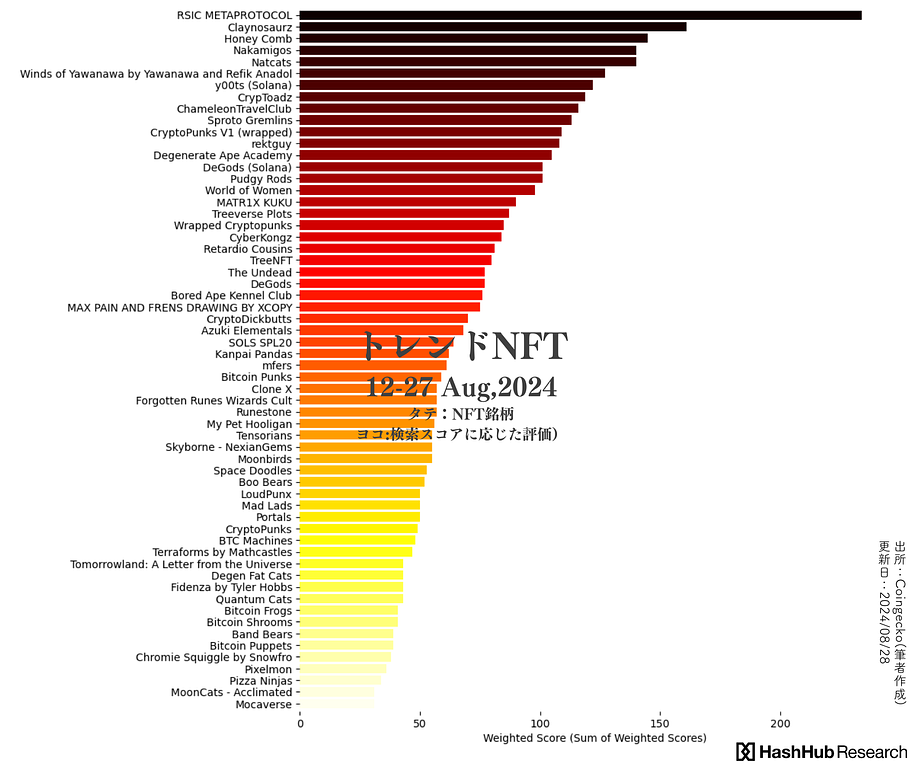 上の横棒グラフは縦軸にNFT銘柄名、横軸に検索トレンド『順位』と『ランクイン回数』を加味して評価したスコアを配置しています。スコアが高いほどに調査期間中の検索トレンド上位、かつ上位ランクイン回数が多い傾向になります。