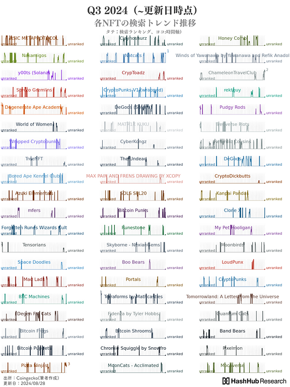 上グラフはQ3 2024年以降(7月1日〜)の検索上位60NFT銘柄の「トレンド推移」を可視化したものです。 縦軸に検索ランク(1~7位、ランク圏外)、横軸に時間軸を配置し、各NFT銘柄の調査期間中のトレンド推移を表しています。