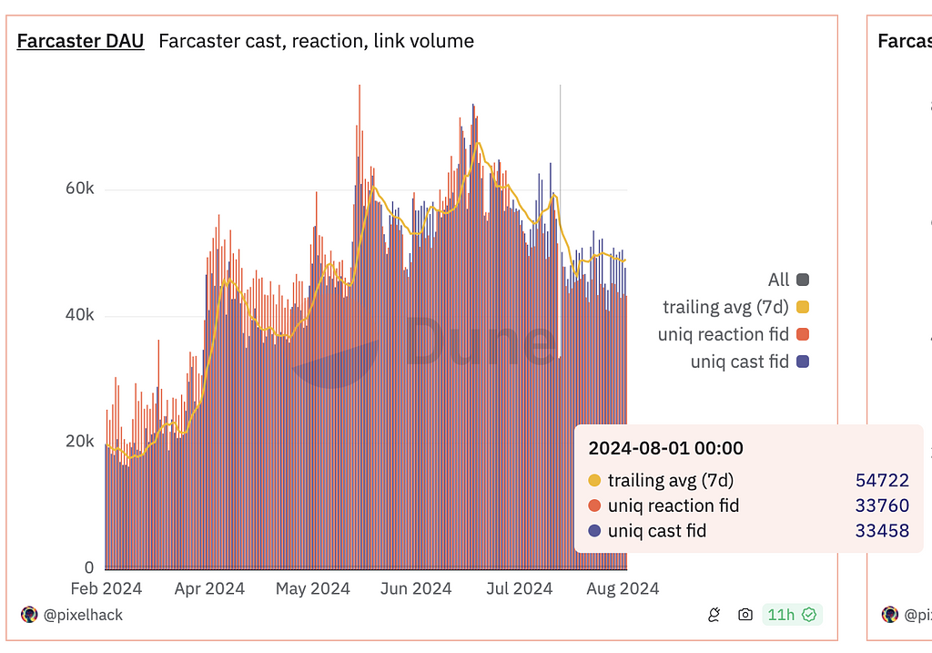 まずは全体的な傾向として、8月に入ってからFarcasterのアクティブユーザー数は、やや減少傾向となっています。黄色線の「trailing avg(7日間の平均)」のラインもが8月初旬に下落していること、そして、キャスト数とリアクション数の両方が低下していることが見て取れます。