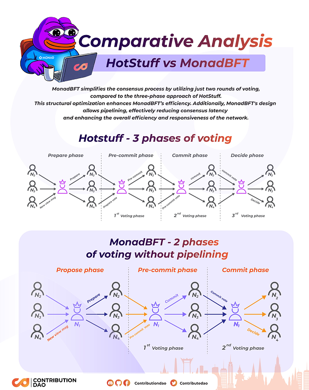 MonadBFTは、Monadブロックチェーンのために特別に設計されたビザンチンフォールトトレランス(BFT)コンセンサスメカニズムであり、HotStuffプロトコルをベースに改良されています。