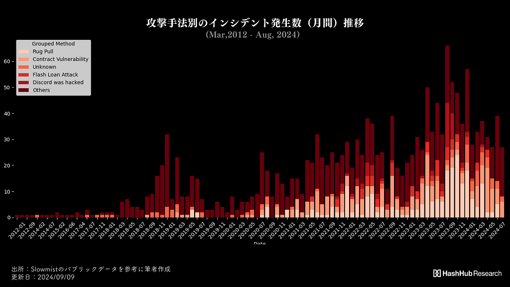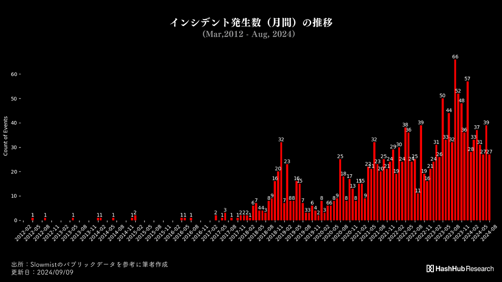 上グラフは2013年3月以降、調査時点までの月間インシデント発生数(Slowmist社が検出した事件に限定)の推移を表しています。2024年08月は計27件のインシデントを確認しています。
