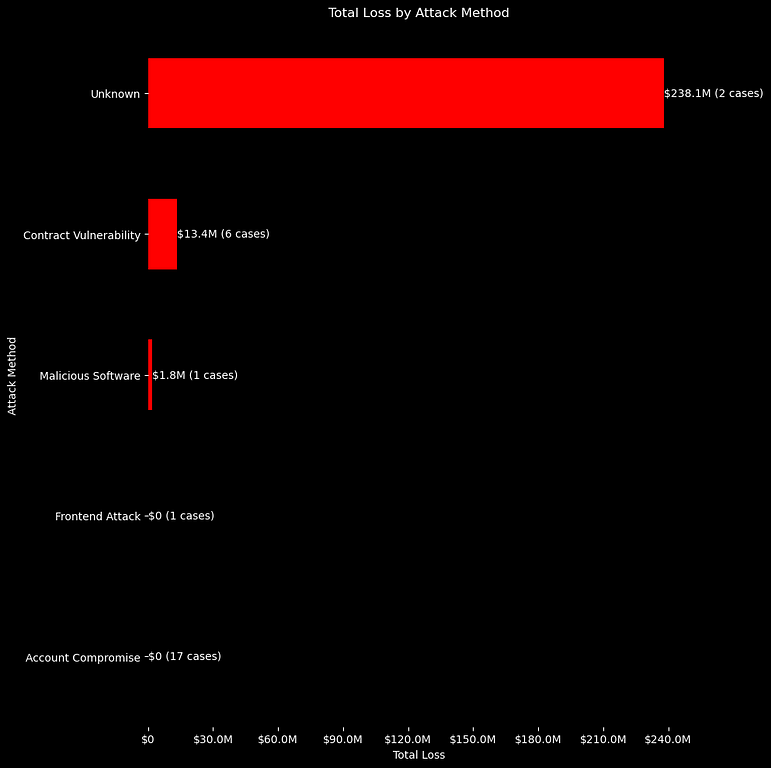 被害額の大きさではUnknown(不明)とContract Vulnerability(コントラクト脆弱性)が目立ちますが、件数では、Account Compromise(アカウント乗っ取り等)が17件と圧倒的に多いことがわかります。