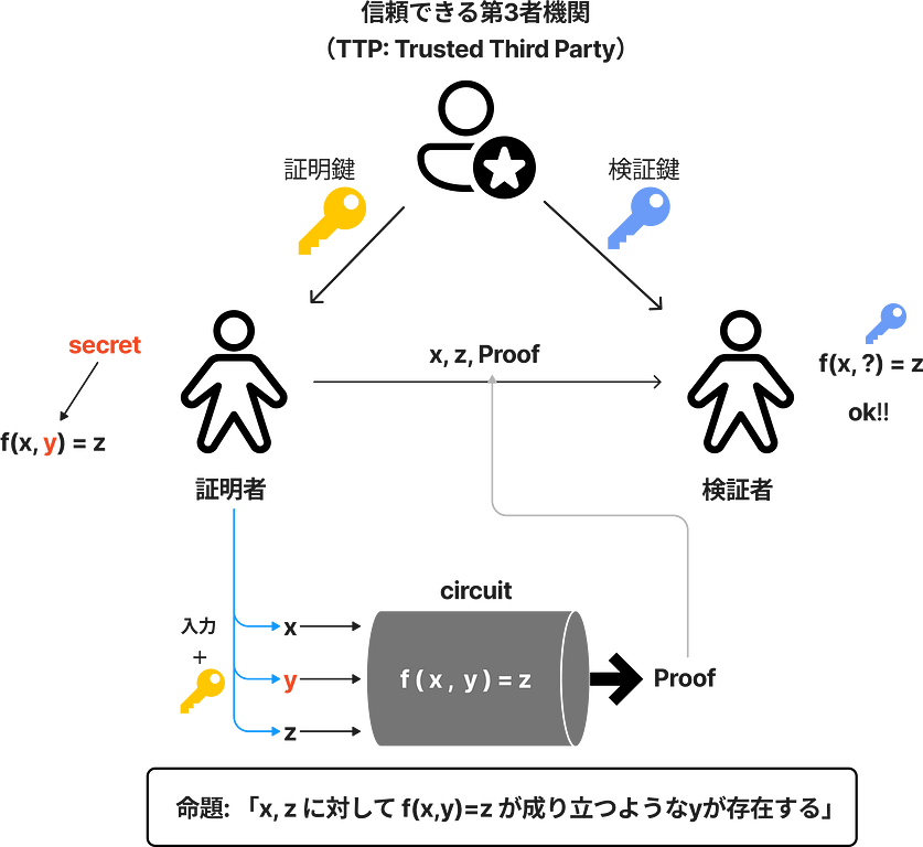 次に、ゼロ知識証明の実装に必要な手順を説明します。まず、前準備として信頼できる第3者機関(TTP)によるTrusted Setupが必要です。これは、ゼロ知識証明に必要な鍵を生成するプロセスです。生成された証明鍵と検証鍵をそれぞれ証明者と検証者に渡します。