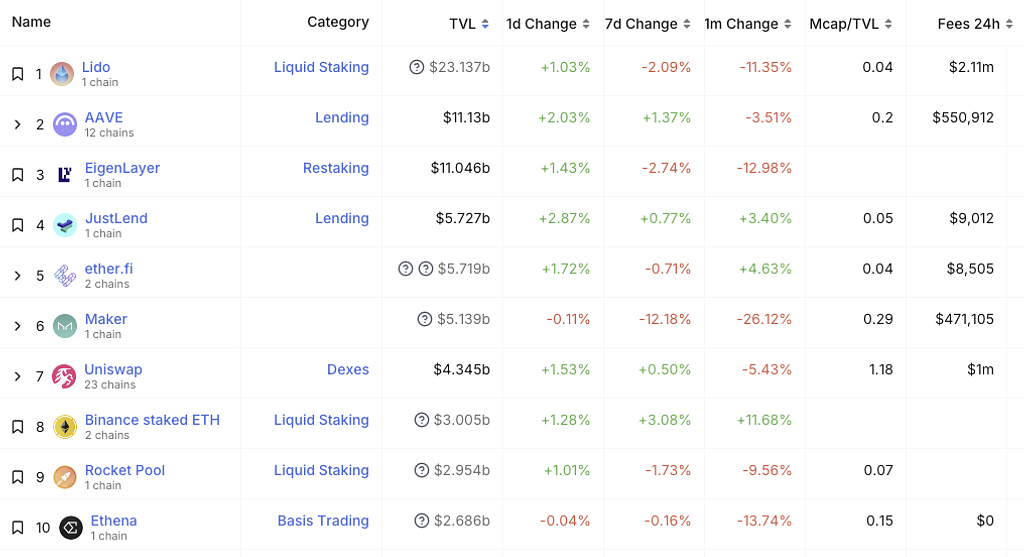 DeFiLamaによれば、全体のTVLは100億ドル以上の減少で、下落傾向にあります。特に主要なDeFiプロトコルでは、Lido、MakerDAO、EigenLayer、Ethenaなどで流出規模が1ヶ月で10%以上となっています。これらはDeFi市場の低調な状況を反映しています。