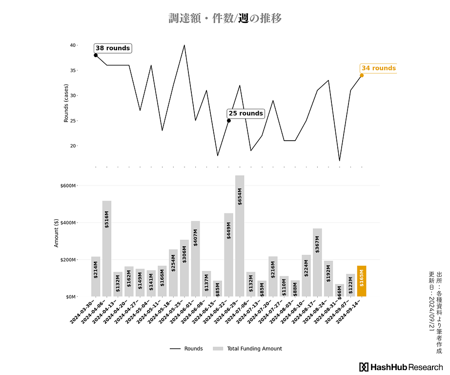 本シリーズでは、どのようなWeb3.0関連のスタートアップやプロジェクトに資金が集まっているのか、その最新の傾向とパターンを解説します。今回の#39では、2024年9月14日から2024年9月20日にかけての資金調達活動を調査し、どのカテゴリーが最も注目を集め、どのような特徴が見られるのかを分析しています。