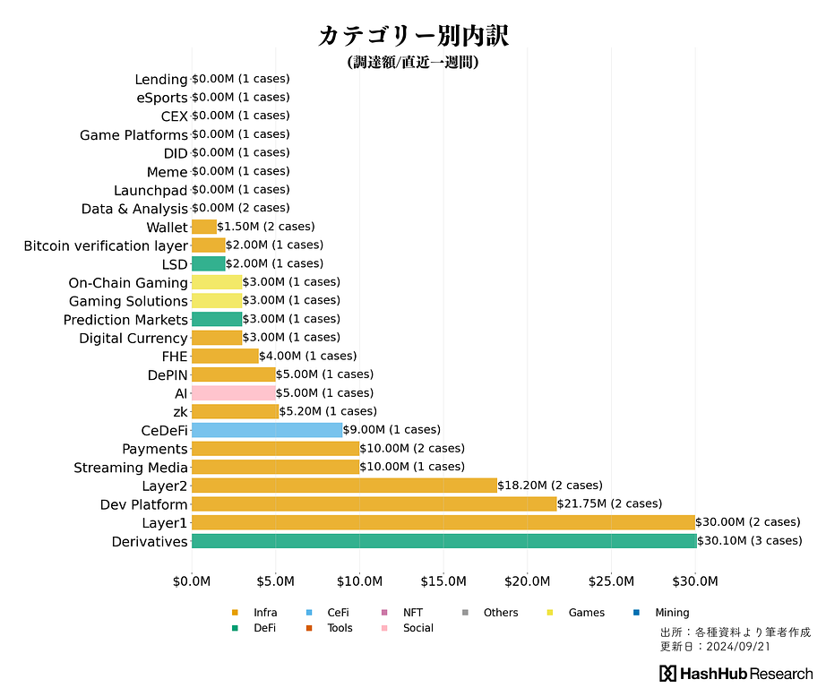 より細かな分類(上図)では、Derivatives取引所($30.1M/2件)、Layer1($30M/2件)、開発者プラットフォーム($21.75M/2件)関連に比較的多くの資金が流れていることを確認できます。
