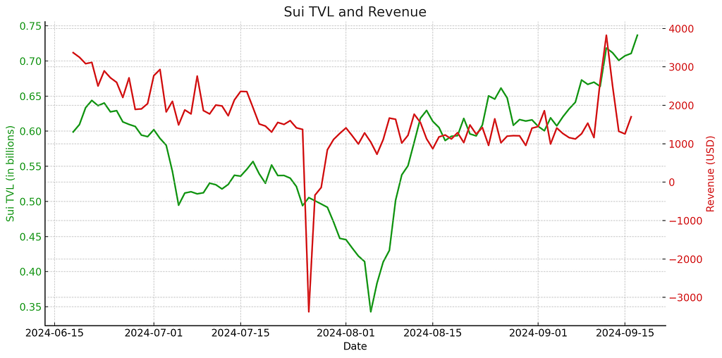 緑色はSuiのTVL、赤色は収益(ユーザーが支払ったトランザクション手数料からプロトコルが得た額)の推移を示しています。8月以降の収益は日次で1,300-1,500ドルで安定しているように見えます。収益の下落から2週間後あたりでTVLが底を突いています。
