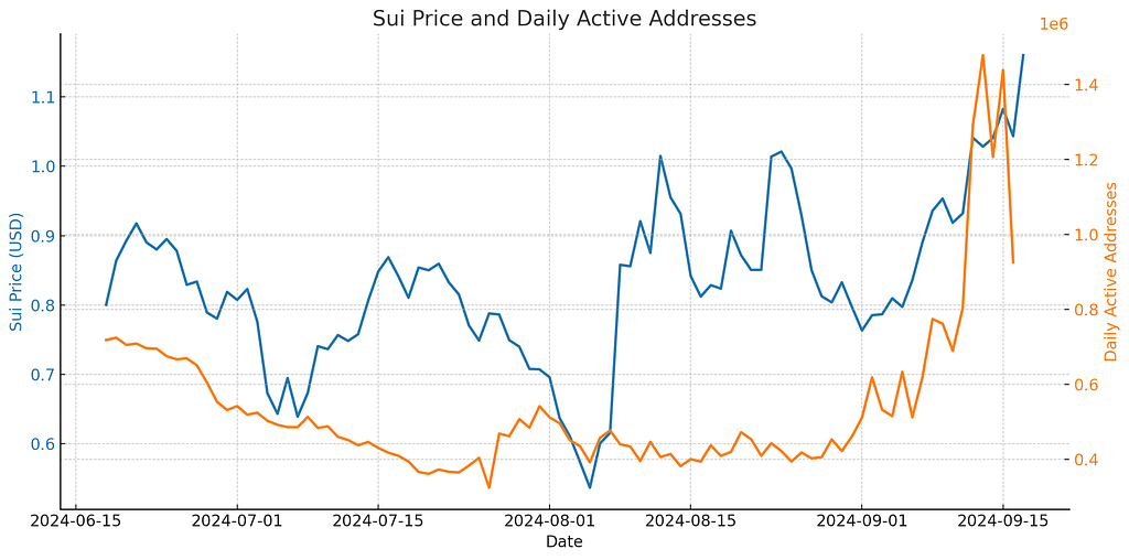 青色はSui価格、オレンジ色がデイリーアクティブアドレスを示しています。2024年6月から8月までは下落して底になり、8月下旬からは急激に価格上昇して1ドルで推移し、9月移行さらに上昇をはじめています。