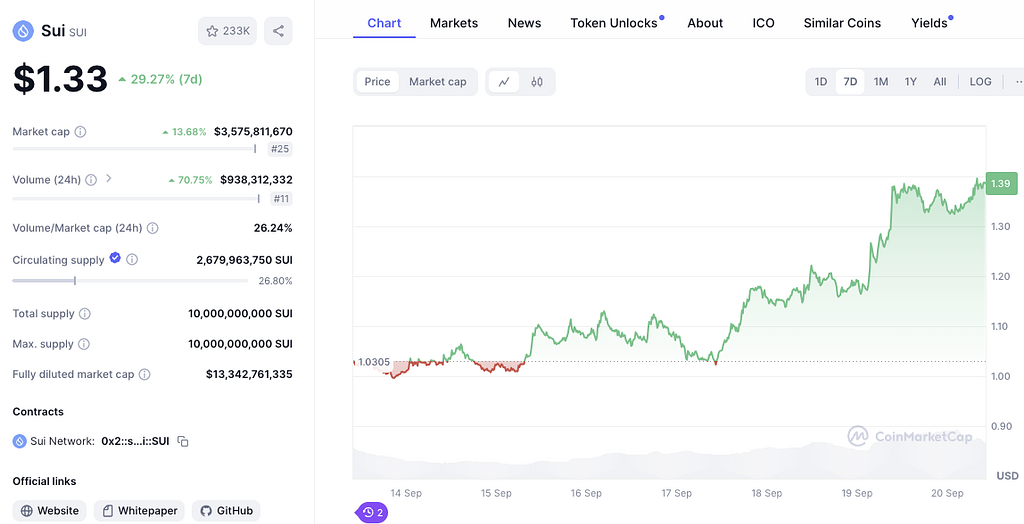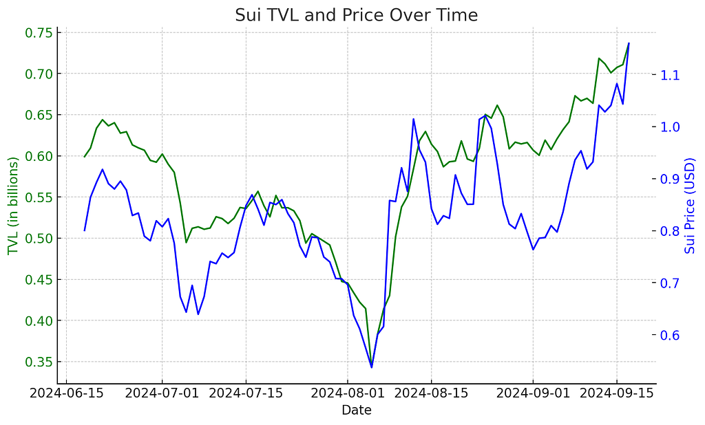 DeFiLamaによれば、SuiのTVL(Total Value Locked)は、2024年8月より増加傾向に転換し、2024年5月の最高水準(約7.51億ドル)に迫る約7.36億ドルにまで成長しています。これに連動するかのように、ネイティブトークンのSUIの価格も上昇傾向にあります。