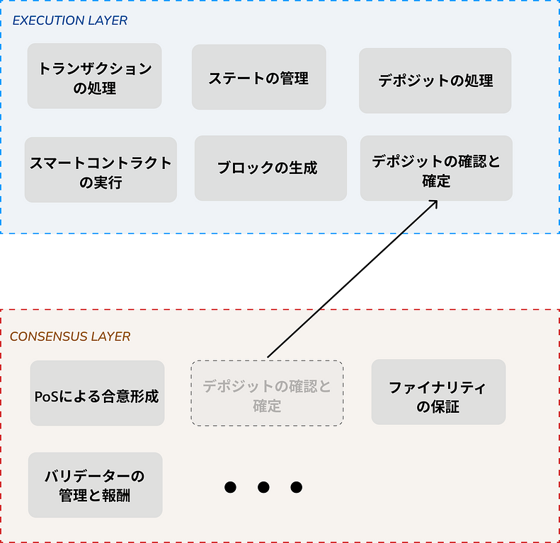 EthereumのコンセンサスにProof of Work(PoW)が使用されていた時代は、デポジットが実行レイヤーで処理され、コンセンサスレイヤーで投票を行ったのち、デポジットが確定されていました。しかし、Proof of Stake(PoS)に移行したことで、もはやコンセンサスレイヤーでの投票は必要なくなり、これを実行レイヤーに戻すことで、デポジット処理の遅延を削減します。この提案により、デポジットの確認時間が約12時間から約13分に短縮されます。