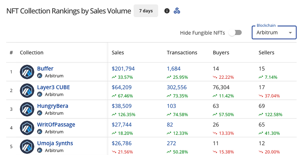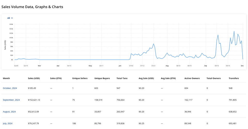 9月のUnique Buyersが、前月の33,857から158,519へと急増。一方Unique Sellersは75と少なく、トレード総数の内訳はほぼ鋳造コントラクト(0x1195cf65f83b3a5768f3c496d3a05ad6412c64b7)が占めていることから、セカンダリーマーケットでの取引数増加ではなく、Arbitrum上のLayer3 CUBEの鋳造数増と考えられます。