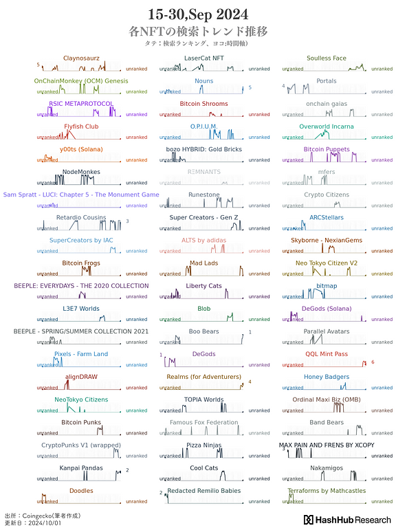 上グラフは2024年9月15日以降の検索上位60NFT銘柄の「トレンド推移」を可視化したものです。縦軸に検索ランク(1~7位、ランク圏外)、横軸に時間軸を配置し、各NFT銘柄の調査期間中のトレンド推移を表しています。