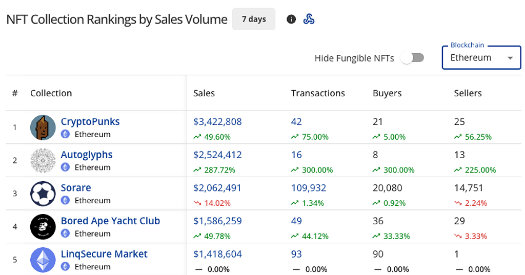 以下、取引量(上位2)及び取引数(上位2)の計3つのブロックチェーン上で過去7日間に活発に取引されているNFTを記録として残します。
