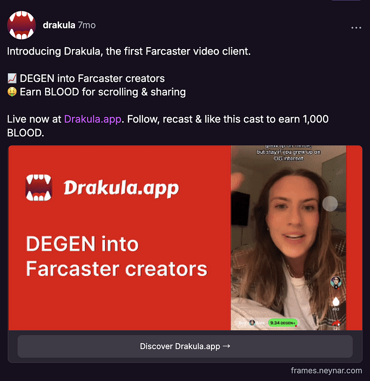 また、DrakulaはFarcasterとも統合されており、動画コンテンツを中心にファンとクリエイターのつながりを強化しています。具体的には、Drakulaで投稿された動画は、自動的にFarcasterにもクロスポストされることで、2つのプラットフォームでの露出が増加する仕組みとなっています。このように、Farcasterのオープンなデータモデルを活用しつつ、ショート動画を通じた新しいエンゲージメントの形を探求している事例として位置付けられています。
