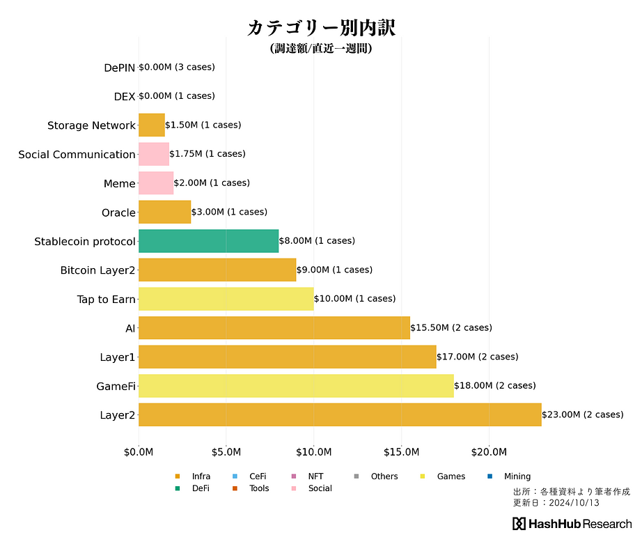 より細かな分類(上図)では、Ithacaを含むLayer2関連(18M/2件)、Layer1関連($17M/2件)に比較的多くの資金が流れていることを確認できます。