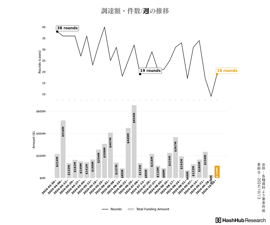 本シリーズでは、どのようなWeb3.0関連のスタートアップやプロジェクトに資金が集まっているのか、その最新の傾向とパターンを解説します。今回の#42では、2024年10月05日から2024年10月11日にかけての資金調達活動を調査し、どのカテゴリーが最も注目を集め、どのような特徴が見られるのかを分析しています。