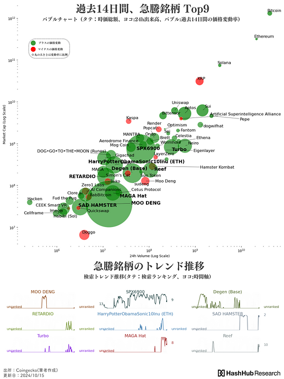 時価総額(タテ)、24h出来高(ヨコ)に沿って各銘柄をプロットしたバブルチャート(過去14日間の価格変動を表す)と2024年10月01日〜更新日時点のトレンド推移を示した折れ線グラフを掲載しています。