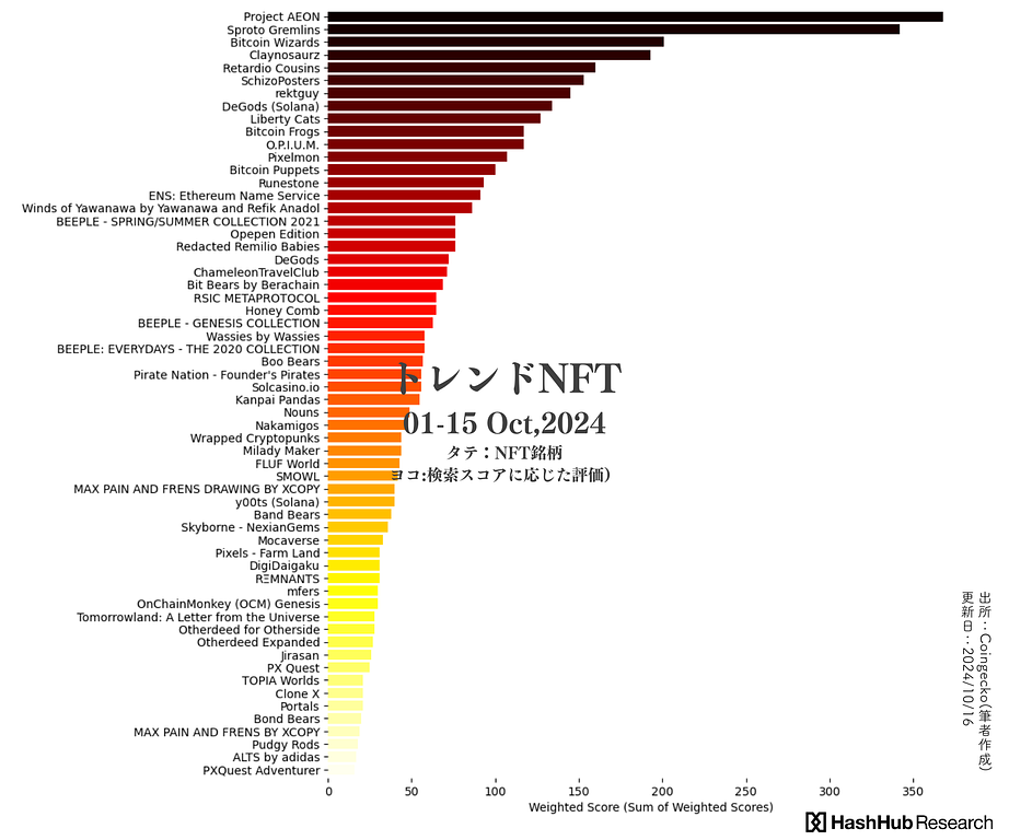 上の横棒グラフは縦軸にNFT銘柄名、横軸に検索トレンド『順位』と『ランクイン回数』を加味して評価したスコアを配置しています。スコアが高いほどに調査期間中の検索トレンド上位、かつ上位ランクイン回数が多い傾向になります。