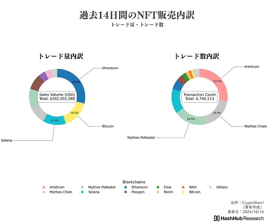 - 過去14日間のトレード数はおよそ474万件、Arbitrum、Mythos Chain、Mythos Polkadotの順に多い