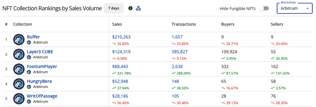 9月中旬以降の傾向と一致する形で、Layer3 CUBEの鋳造トランザクションの増加に伴い、Arbitrum上でのNFT取引(多くは鋳造Tx)が活発化している様子が見受けられます。