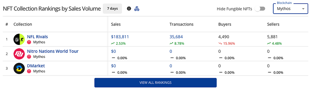 Mythical GamesがリリースしているNFL(National Football League)公式ライセンスを持つNFL Rivalsと呼ばれる人気タイトルの影響でMythos Chain NFTの売り上げが増加。