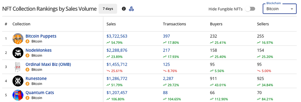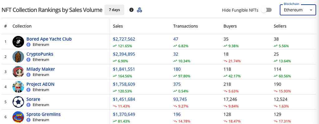 以下、取引量(上位2)及び取引数(上位2)の計3つのブロックチェーン上で過去7日間に活発に取引されているNFTを記録として残します。