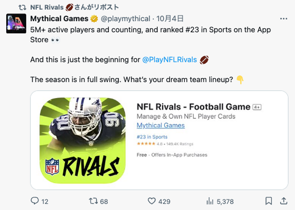 なお、この統合後、10月4日時点でactive playersが500万人を超え、App Storeのスポーツ部門で23位にランクインしたとMythical Gamesがツイートしています。