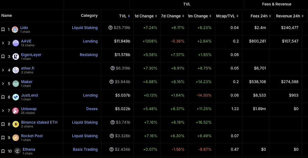 チェーンごとのTVLでは、全体的に増加傾向ですが、Base、Sui、Aptosの増加率が50%を超えているのは注目に値するでしょう。以下、チェーン別に現状整理を行います。