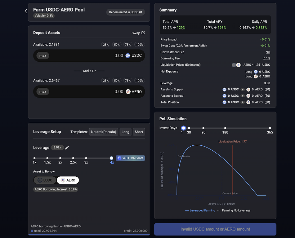 流動性ファーミングにおいては、どのトークンに対してレバレッジをかけるか(Neutral/Long/short)を行うか、倍率はどれくらい設定するか、結果想定APYはどうなるか、を直感的に操作できるという特徴があります。