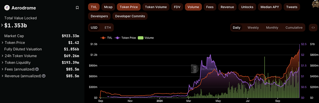 Aerodromeは、TVL、取引量、ガバナンストークンAERO価格、いずれも上昇傾向にあり、BaseのDeFiアクティビティの中心的な存在です。10月には10億ドル(1 billion)の大台を超えました。