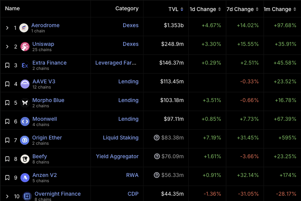 TVLの増加要因に寄与しているDeFiプロトコルは、トップのAerodrome、Uniswap、Extra Finance、Moonwellなどが考えられます。