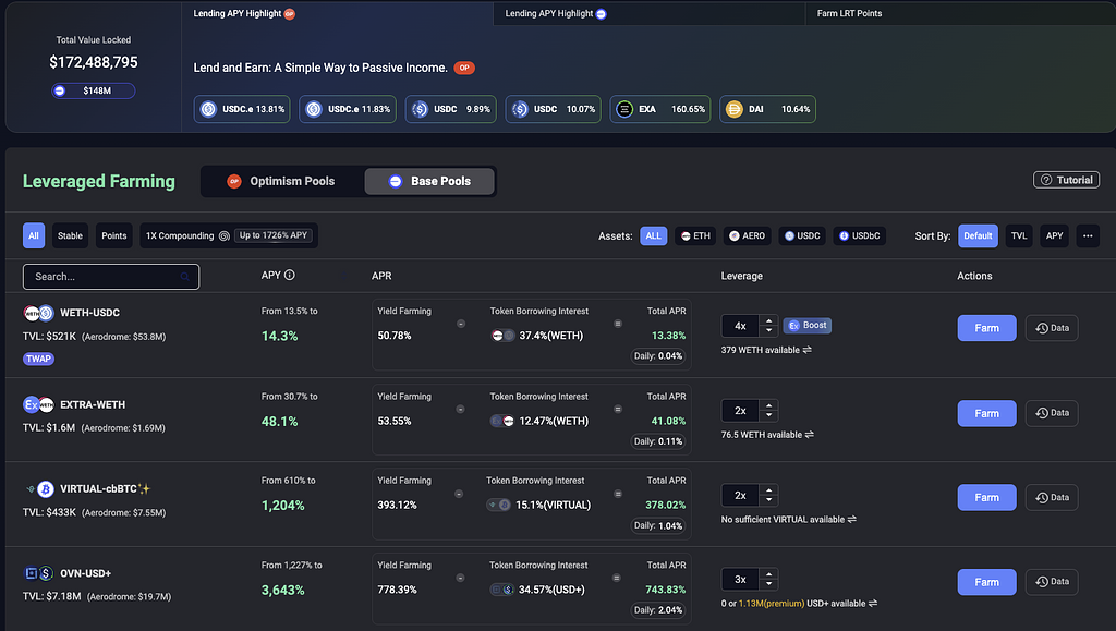 Extra Financeは、OP MainnetとBaseのDeFiプロトコルに展開されている流動性プールでのファーミング、レンディング、ステーキングにレバレッジを簡単なUIから掛けられる仕組みを提供しています。BaseではUniswapに次ぐ1.46億ドルのTVLがあります。