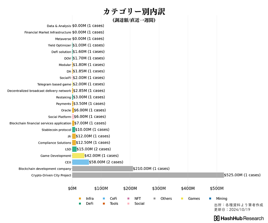 この期間中、公開された資金調達額ではその他($735M/2件)、CeFiセクター($58M/2件)、インフラセクター($47.5M/9件)の順に多くの資金調達報告を確認しています。