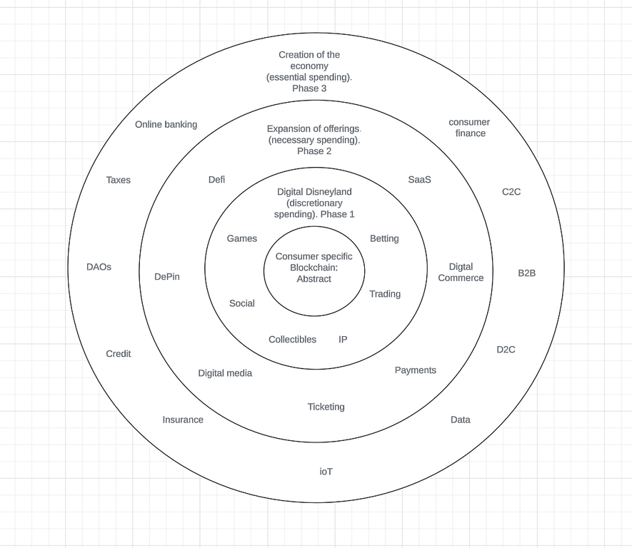 - フェーズ1:娯楽支出:最初の5000万人のユーザーは、ゲームやソーシャルプラットフォーム、トレーディング、カジノ、デジタルコレクティブルなど、余暇を楽しむためのアプリケーションを中心。これらのアプリは、既存のWeb2の課題である高額な手数料や地理的な制限、検閲リスクを解決し、急速な普及を目指す。