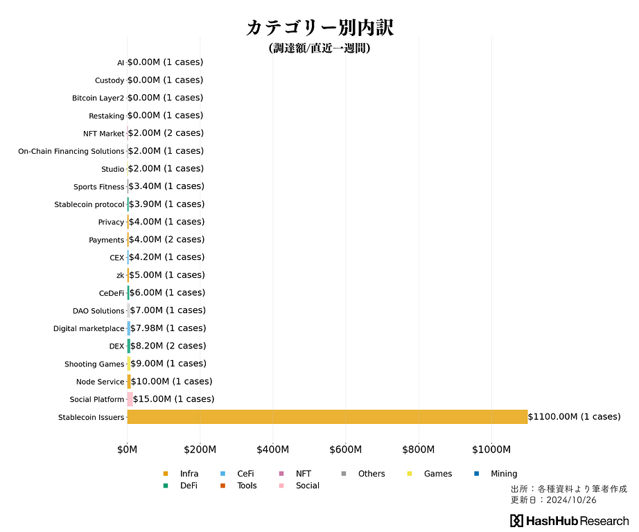 より細かな分類(上図)では、ステーブルコイン・イシュアー($1.1B/1件)、ソーシャル・プラットフォーム($15M/1件)、ノードサービス関連($10M/1件)に比較的多くの資金が流れていることを確認できます。