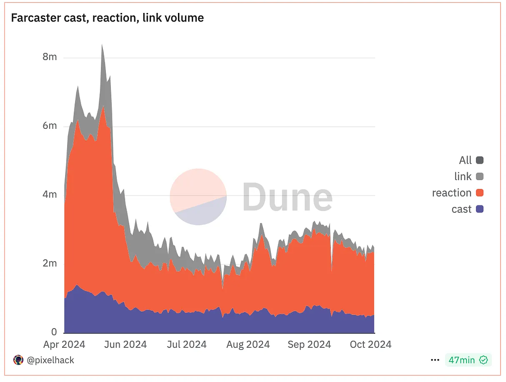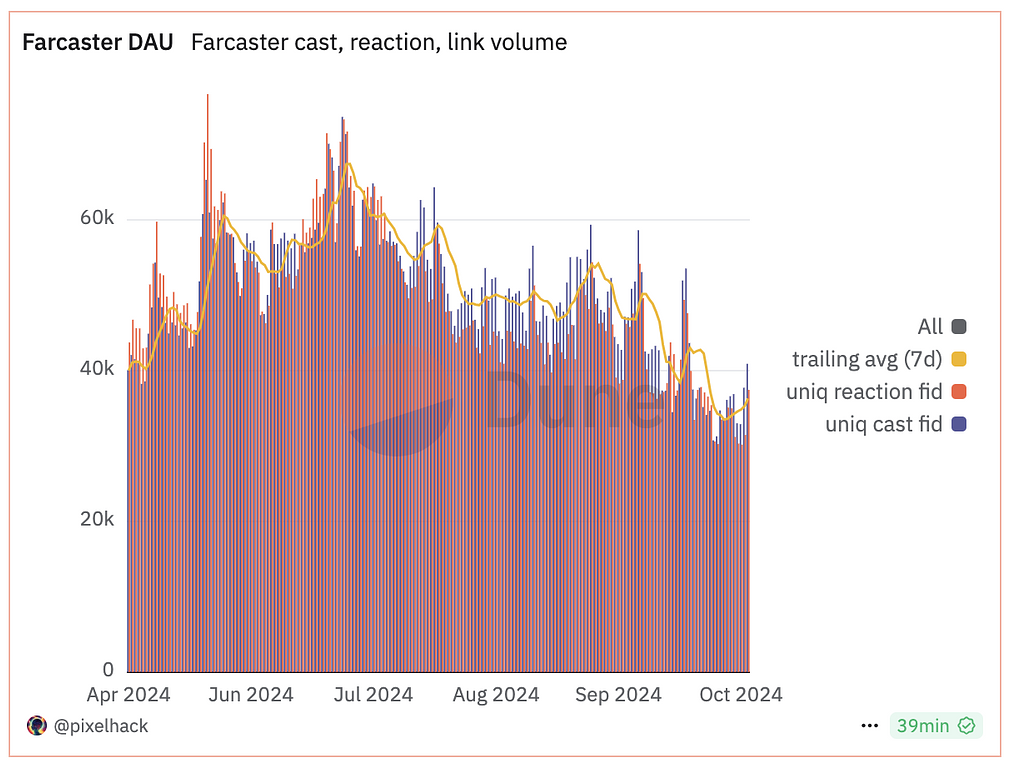 10月のFarcasterのDAU(デイリーアクティブユーザー)は、全体的に減少傾向が見られます。グラフ上の7日間の移動平均(黄色のライン)も下向きに推移しており、日次のキャスト数やリアクション数(青と赤のバー)も以前より低くなっています。