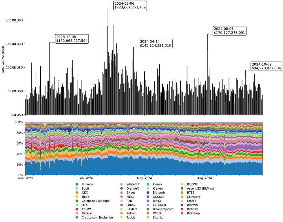 以下の図はCoinGecko APIの信頼性を示すTrust Score7以上の取引量と市場シェアを示すグラフです。最も大きいのがBinance、次いでBybitでありCrypto.com、Pionexなどが取引量の市場シェアを伸ばしました。