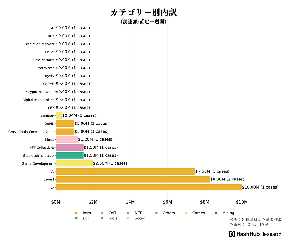 より細かな分類(上図)では、zk関連($10M/1件)、レイヤー1($8.3M/2件)、AI関連($7.5M/1件)に比較的多くの資金が流れていることを確認できます。