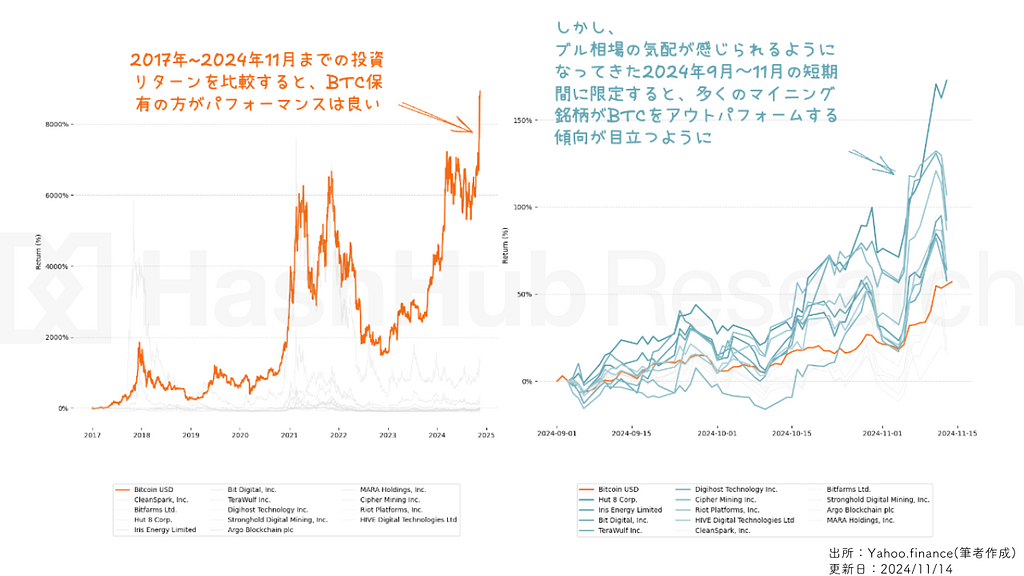 「BTC vs マイニング株、果たしてどちらが高パフォーマンスなのか?」 過去のデータを基に冷静に見てみると、中長期(2019~2024年11月)ではBTCを保有する方がより高いパフォーマンスを示してきました(※上スライドの左チャート参考)。