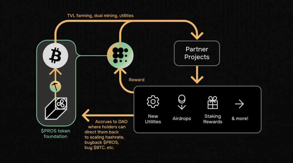 Prosperは、機関投資家グレードのビットコインマイニング能力をオンチェーンで提供し、Bitcoinの流動性ファーミングを通じて持続可能なフライホイール構築(PROSトークンの価値を最大化する)を目指すDAOプロジェクトです。