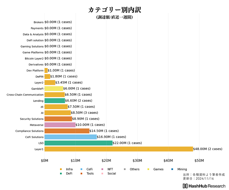 より細かな分類(上図)では、Layer1関連($48M/2件)、LSD($48M/2件)、CeFiソリューション関連($16.9M/1件)に比較的多くの資金が流れていることを確認できます。