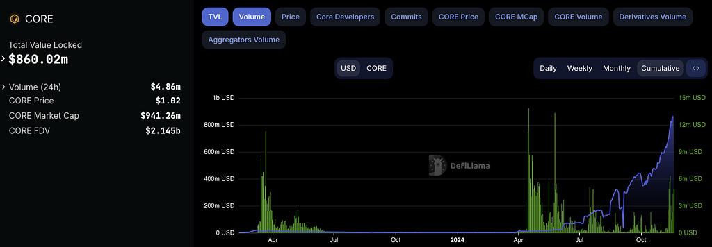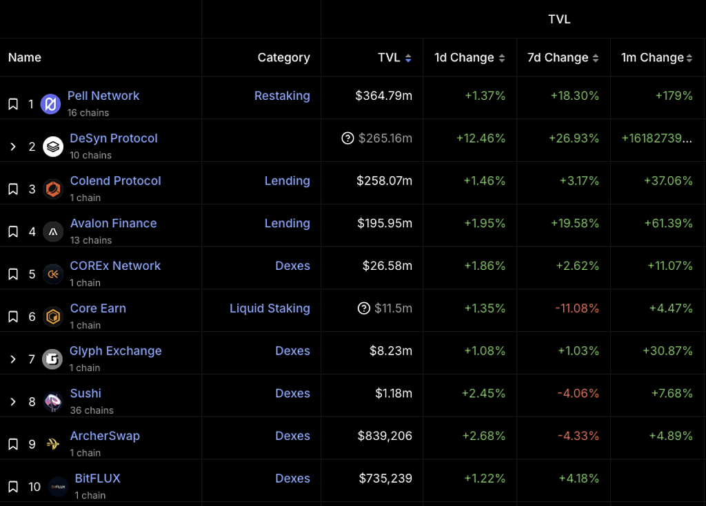 DeFiLamaによれば、COREは現在TVLはおよそ8.6億ドルで、順位はAptosに次ぐ13位です。増加傾向にあり、BTCFiのナラティブも重なり現在ではその勢いを強くしている印象があります。
