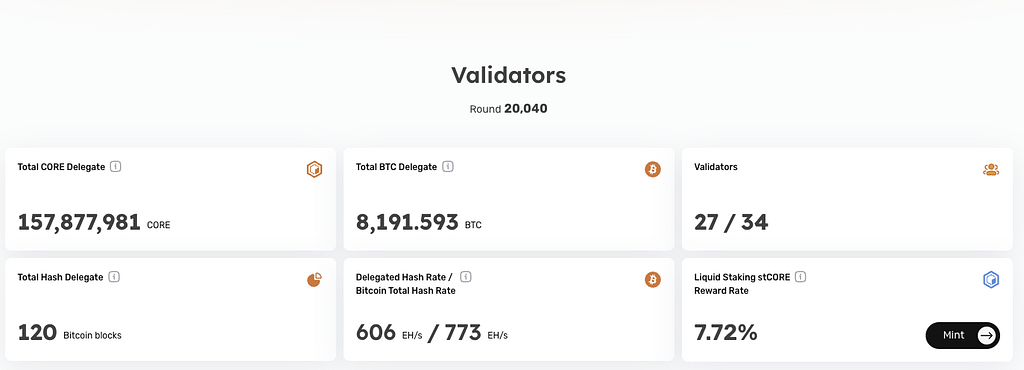 バリデータはスコアの上位から選出され、選ばれたバリデータがCore Chainのブロック生成に参加します。この順位は各ラウンド(エポック)ごとに更新され、選ばれたバリデータがその期間中のブロック生成を担当します。Core Chainのバリデーターセットは、現在27で構成されています。