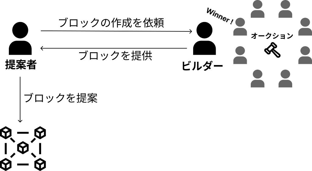 現在、MEV-Boostを活用して**PBS(Proposer-Builder Separation)**を部分的に実現しています。PBSとは、バリデータがブロック提案の機会を得た際に、ブロックの内容の選定を「ビルダー」と呼ばれる専門のアクターにオークションで委託する仕組みです。この分離により、バリデータはトランザクションの順番を決めたり、どのトランザクションを含めるかを選択したりする権限を持ちません。ビルダーは、その選択を通じて収益を最大化することができます。