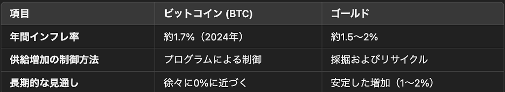 2024年現在、新規マイニングによるBitcoinのインフレ率は年間で1.7%です。それに対して、ゴールドの年間供給増加率は歴史的に約1.5%~2%です。ゴールドの価格や、エネルギーコストによって損益分岐点に見合う新規鉱山の開発が行われて、毎年新しく採掘されたゴールドが市場に供給されます。