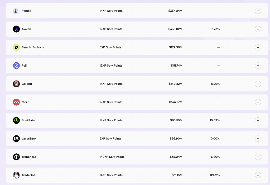 DeFiエコシステムにおけるSolvBTCやSolv.LSTを利用できるプロジェクトは、こちらのページに一覧となっています。
