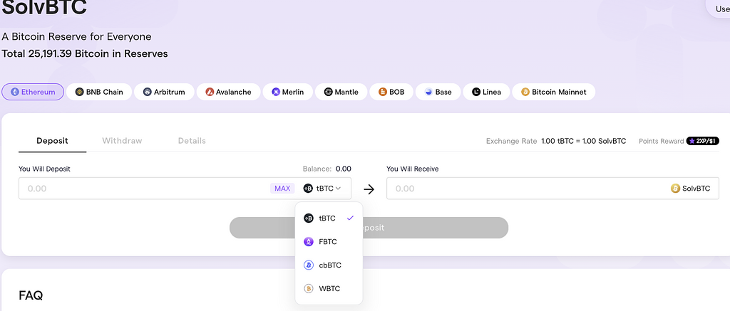 後述しますが、SolvBTCにデポジットしたあと、さらにステーキングを行うことで、Solv Protocol上のLSTを入手可能です。