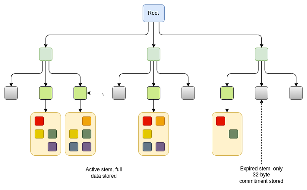 この方法を設計するには、「最近」はいつからなのかという基準や「チャンク」の定義を明確にする必要があります。例えば、EIP-7736では上図のようなVerkleツリーを基にした「stem-and-leaf」デザインを採用しています。このデザインでは、アカウントヘッダー、コード、ストレージスロットなどが一つのstemに格納され、6か月間アクセスがなければデータは削除され、32バイトのコミットメント(stub)のみが保存されます。このデータを利用する際には、stubを使ってデータを復元する必要があります。