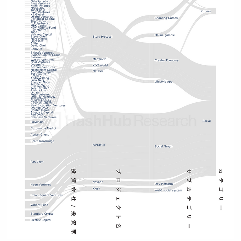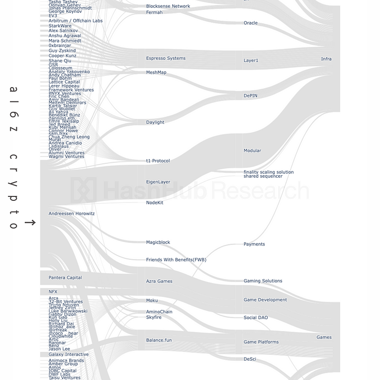 上はa16z cryptoが2024年に参画した一連の資金調達ラウンドの資金の流れと量を可視化したサンキーダイアグラムです。
